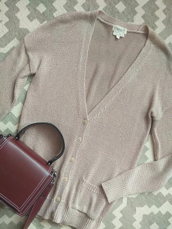 Отличный кардиган с люрексовой нитью в цвете пудра. Состояние идеальное. Длина 75, рукав приспущен 76 от горловины.
