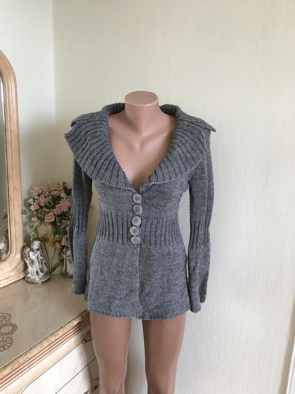 Сірий кардиган на ґудзиках з довгим рукавом.Декольте оформлене фігурним коміром.Тканина м'яка і пухнаста,склад: 30% льон, 30%- акрил, 40%- поліамід. Довжина-60 см, ПОГ: 50-59 см., Рукав-59 см.