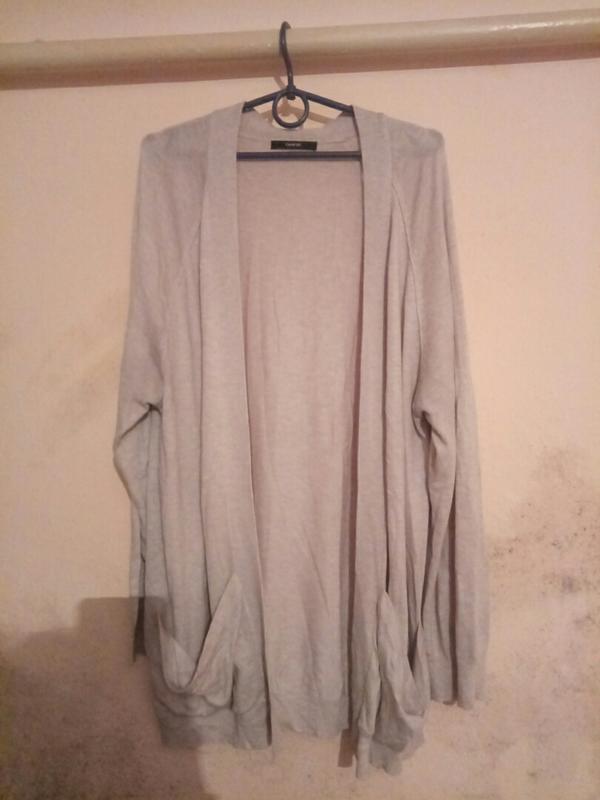 тонкий вязаный кардиган бежевого цвета, длинные рукава, не застегивается, полы свободные, внизу по бокам большие широкие карманы, очень приятный к телу. ПОГ 60см, ПОТ 56см, ПОБ 54см, длина рукава с плечом 69см, длина изделия 76см