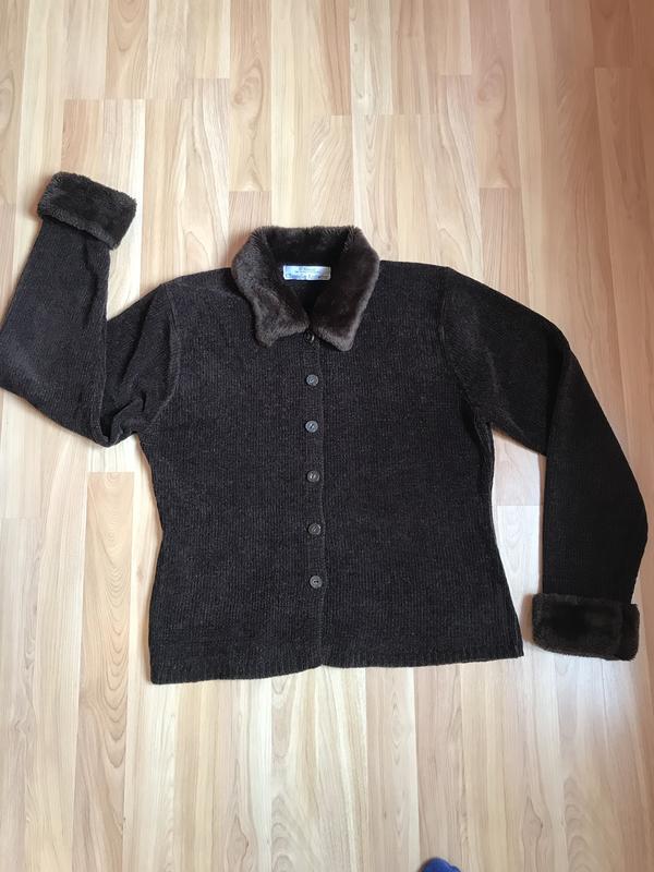 Кофта, кардиган с меховым воротником и манжетами В идеальном состоянии Размер 14-16 (L-XL). Замеры на фото Отправлю УП или Нп после полной оплаты на карту или наложенным платежом после предоплаты за пересылку в обе стороны Смотрите мои другие объявления