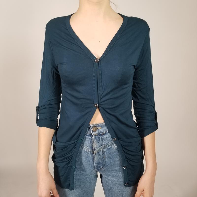 Легка кофточка, яка може бути і як накидка-кардиган Застіпається на гудзики Є красиві кишені Рукав довгий, та за допомогою застібки стають 3/4 В наявності кавовий, морської хвилі та білий Заміри: ОГ 44 см, довжина 80 см