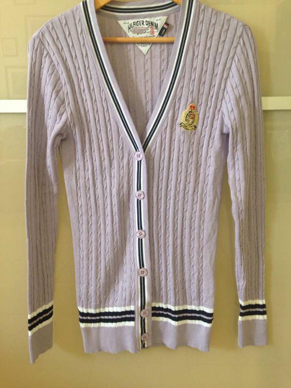 Кардиган, свитер Tommy Hilfiger нежно-сиреневого цвета, с V-образным вырезом, на пуговицах, с фирменой нашивкой. Кардиган очень нежного и приятного цвета, мягкий материал, отлично носится. Размер указан XL, но свитер маломер, отлично подойдет на L, по длинне 68 см., по плечам 39 см., обьем груди 76 см., длинна рукава 66 см. Свитер хорошо тянется. Состояние идеальное, без пятен, зацепок, катыршек.