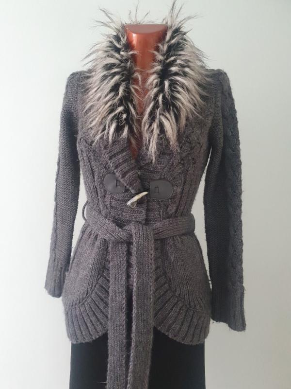 теплый вязаный кардиган,воротник шалевый(искусственный мех можно убрать) длина 67 рукав 58 ширина по груди 43 талия 38 бедра 47 плечи38 все замеры в нерастянутом состоянии