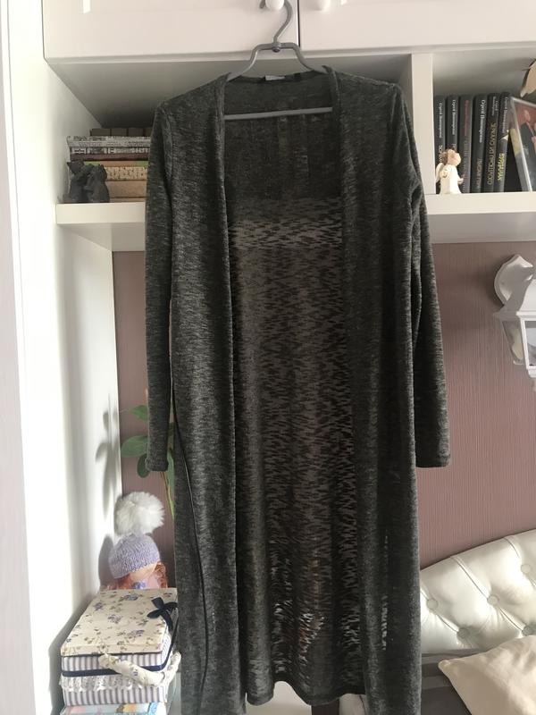Трикотажный удлиненный кардиган на тонком кожаном поясе с разрезами по бокам.