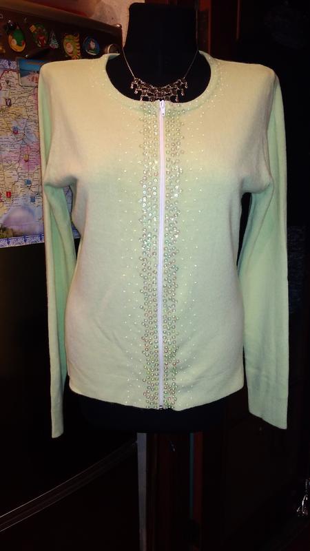 Кофточка салатовая 46р.нарядная,в очень хорошем состоянии,цвет намного ярче и сочнее,чем на фото,украшена пайетками,тоненькая,но тёпленькая. ПОГ 50,ПОТ 43,рукав 65,плечи 41,длина 62,ПОБ 46.