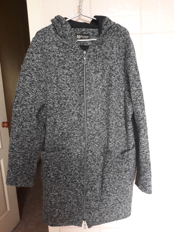 Тёплый кардиган с капюшоном, р. 50-54 Длинна 80см, от подмышки до подмышки 57см, полулбхват бёдер 58 см, длинна рукава 60 см.