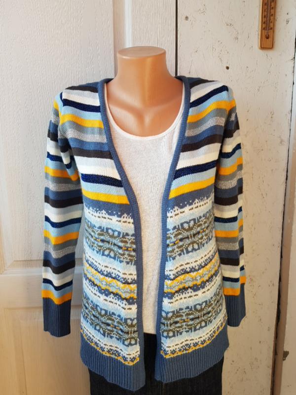 Трикотажный,в контрастные полоски.Длина-65см,ПОГ-от 43-48см.Р-р S-M.