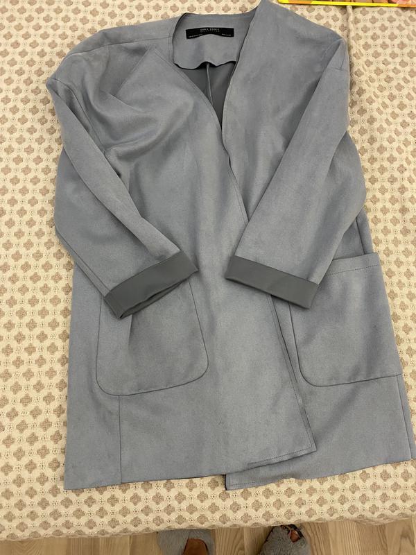 Идеальная вещь, палочка-выручалочка на прохладную погоду. Оверсайз, размер указан XS по факту и на м будет идеально. Размер серо-голубой, ткань как экозамш, без дефектов