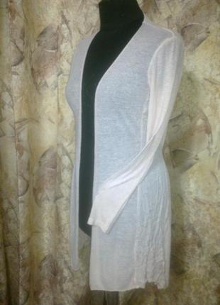 Стильный, легкий кардиган, модного цвета "пудра", из комбинированных тканей, вязаного трикотажа и мятого шелка, на бочках, имеет прямой, приталенный фасон, сзади на коттонновой завязке. Изготовлен брендовой, итальянской фирмой, из 50%полиестера, 30%района , 10%льна и 10%шелка, приятная. мягкая, тонкая. вязка и шифон. Размер S, состояние очень хорошее. РАЗМЕРЫ: ПОГ,=44см, ПОТ.=45см, ПОБ.=52см, Длн.издл.=87см, Длн.рукв.=61см. Шир.плеч=40см. ЛОТЫ КОМБИНИРУЮ!!!