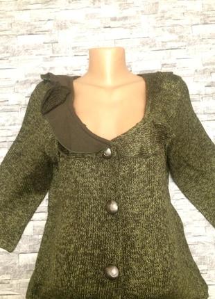 Комфортная , мягкая кофта..Декор по горловине -воланы. Состав нити смешанный-акрил,коттон , эластан. Размер L производство Турция. Замеры ПОГ 52 см , еще тянется.Длина от горловины по спинке 60 см ,рукав от плеча 46 см . На наш размер подойдет от 50 до 52 , только степень облегания будет разная .. Состояние идеальное