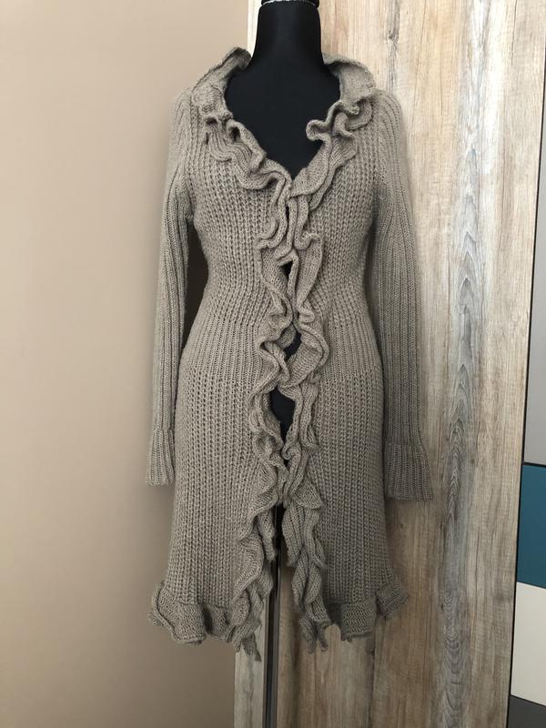 В отличном состоянии, застёжка на крючки( потайные), не видно... Состав : 75 % шерсть, 25 % акрил. Очень тёплый и мягкий. Замеры: длина 99 см, ширина по груди 40, ширина по талии 35, ширина плеча 8, длина рукава от плеча 69 см.
