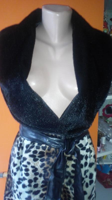 Тепленький леопардовый кардиган с меховым воротником в размере 36р,отлично сяден на размер С и небольшую М.Очень приятный к телу мягкий бархатный материал,шелковый черный подклад. Длина-74см,ПОГ-45см.,пр-во Турция