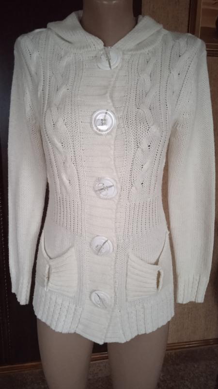 Кофта в'язана, білого кольору, з капюшоном. Розмір S. Фірма Xiaorongyang. Довжина по спинці 65 см. Довжина рукава 59 см. Ширина 46 см. В гарному стані.
