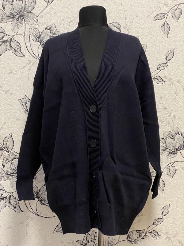 кардиган оверсайз темно синего цвета, в очень хорошем состоянии. Состав: 63% вискоза; 30% полиэфир; 7% полиамид. Подкладка: 100% полиэстер. длина кардигана 72 см плечи спущены; длина плеча 26 см длина рукава от плечевого шва 42 см ПОГ под мышками 64 см ПОТ 62 см ПО снизу 52 см. Возврат не предусмотрен. Доставка за счет покупателя