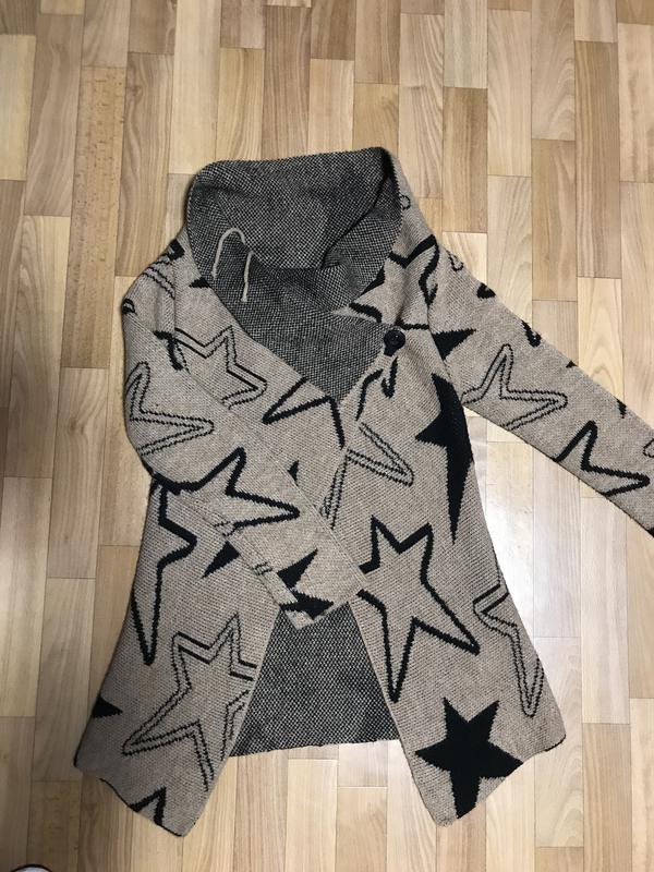 Очень тёплый, лёгкий и стильный кардиган. Производство Италия 🇮🇹, марка P. IVA Можно носить под любую одежду, брюки, юбку, платье, ботинки или ботфорты. Вещь очень хорошего качества! Горловина закатывается, внутри шнуровка, снаружи пуговица. Можно ниже закалывать. Ткань очень приятная, мягкая, отлично тянется. Под мышками-50 Длина рукава-60 Длина-88 Все вещи куплены в магазине или за границей. Смотрите, может что-то ещё понравится, экономьте на доставке. Хороших Вам покупок!