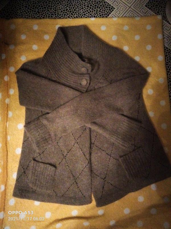 Кардиган пуховый, высокий воротник, низа свободного кроя,кармани. Декорирован ромбовым узором,цвет серо - шоколадный. Склад Лана/ альпака/ нейлон. Очень теплый. ПОГ 52, д. 60