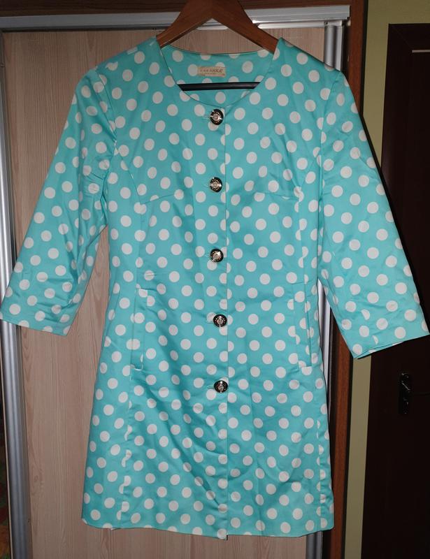 Женский кардиган бирюзового цвета в горошек, ткань х/б, размер 42, очень красиво обтягивает талию, украшен большыми пуговицами, есть два кармана.