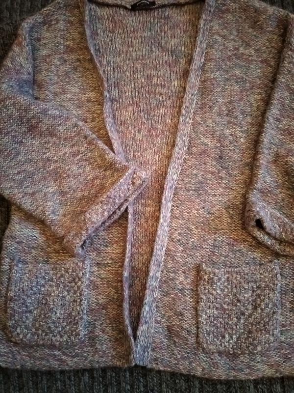 цвет-меланж, без пуговиц, карманы, Дл-68,, рукав от ворота-58 см(3/4) , плечи- спущены, 13% шерсть, 13% мохер, Promod