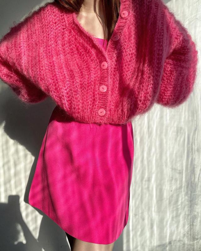 Объемный кардиган ручной вязки. Легко сочетается с платьями и с повседневными образами. Состав: мохер.