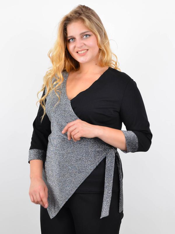 Ефектна комбінована кофта з чорного еластичного креп-дайвінгу та блискучого трикотажу з люрексом. Асиметричний крій на запах із грубоким вирізом Розмір 50-52: Розмір 54-56: Розмір 58-60: Розмір 62-64: