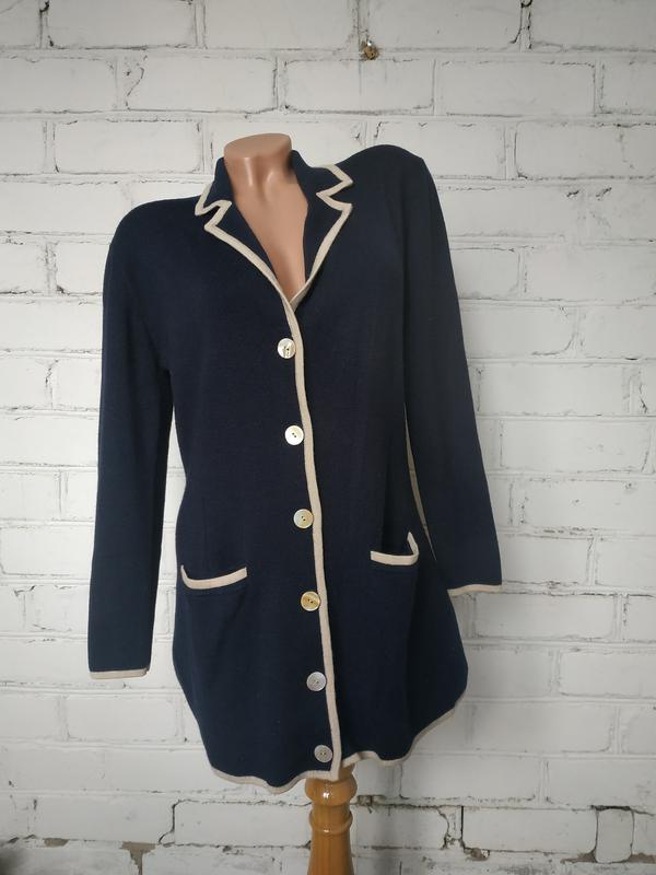 Кардиган/жакет тёмно-синего цвета с бежевой отделкой, плотный трикотаж. Дефектов нет, есть немного катышек. Длина от плеча 73 см, ПОГ 52 см, ПОТ 46 см, плечи 41 см, рукав от плеча 54 см. 100% предоплата на карту, доставка за счёт покупателя