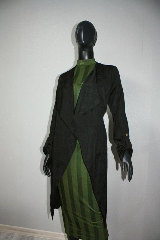 Стан нової речі. Без нюансів. Виглядає дуже гарно, стильно та сучасно. Має гарний вигляд та зручний у носці крій. Виконаний з гобеленової тканини, що має малюнок дрібних гілочок та квіточок. Модель іде прямою, подовженою. Іде без застібок. Воріт - відложний, великими трикутниками. Рукав - довгий, підколюється стяжкою. По спинці є стяжка матеріалу по широкій вшитій резинці. Є дві врізні вертикальні кишені. Країна-виробник: Вьєтнам. ПО (у вільному та максимально розтягнутому стані): грудей 54-60 см, талії 40-58 см, стегон 50-62 см, довжина (до стяжки по спинці/повна) 40-44/98 см, рукав 62,5 см, рукав підколотий 49 см, у біцепсі 18-19 см, плечі 40 см. Состав: склад не зазначено, а за відчуттями це - поліестер та еластан (тягнеться) Доставка: Нова пошта або Укрпошта, або Джастін, або MeestExpress після повної !!! (з урахуванням комісії, якщо термінал або банк бере за послуги) оплати на карту