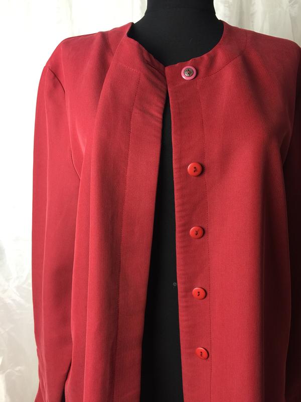 Стиль минимализм, сочный цвет, потайная планка застежка, по бокам разрезы (нюанс есть фото) ткань плотная хорошо ложится, практичная вещь Идеально в дорогу, плечи 42; ширина 58; длина 75; рукав 60