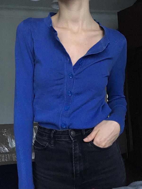 Кардиган насиченого синього кольору на гудзиках. Розмір S, одягнуто на М, добре тягнеться. Матеріал видно на бірці - котон+нейлон (виглядає як тонка в'язка). Стан дуже хороший