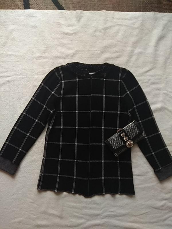 Оригинальный трикотажный кардиган черный в клетку в стиле "Коко Шанель". Ткань очень мягкая, приятная к телу. Стильный, шикарно смотрится. По фигуре ложится идеально. Спереди на замке. Воротник полустойка. Весна-осень - то, что надо. Длина по спинке 72 см. Плечи 38 см. Длина рукава от плеча 59 см, снизу манжет. ПОГ 48 см. Тянется хорошо. Размер написан М - подойдёт на L. Состояние новой вещи. В носке не был. Бумажная бирочка срезана.