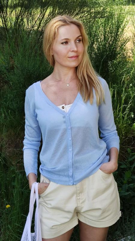 Блакитна, напвпрозора кофта на ґудзиках на літній-весняний період або для зимовоговідпочинку в теплих краях. Розмір М