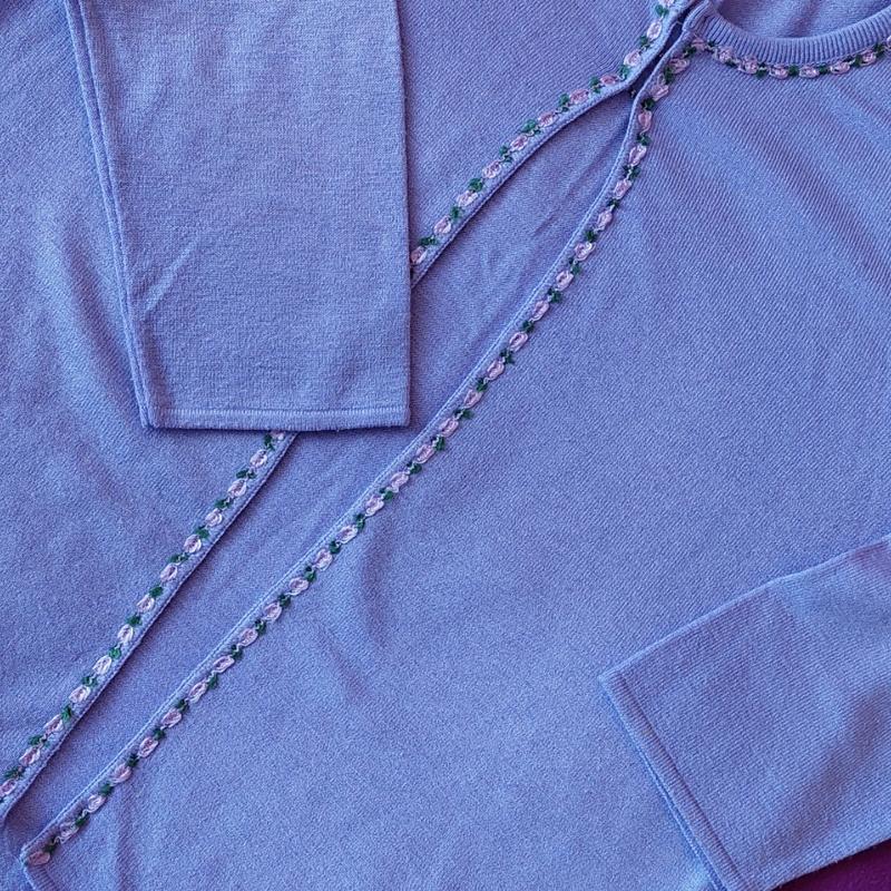 Легкий кардиган із застібками на грудях. Рукав 3/4. Світло фіолетового кольору. Пів об'єм грудей 55см.