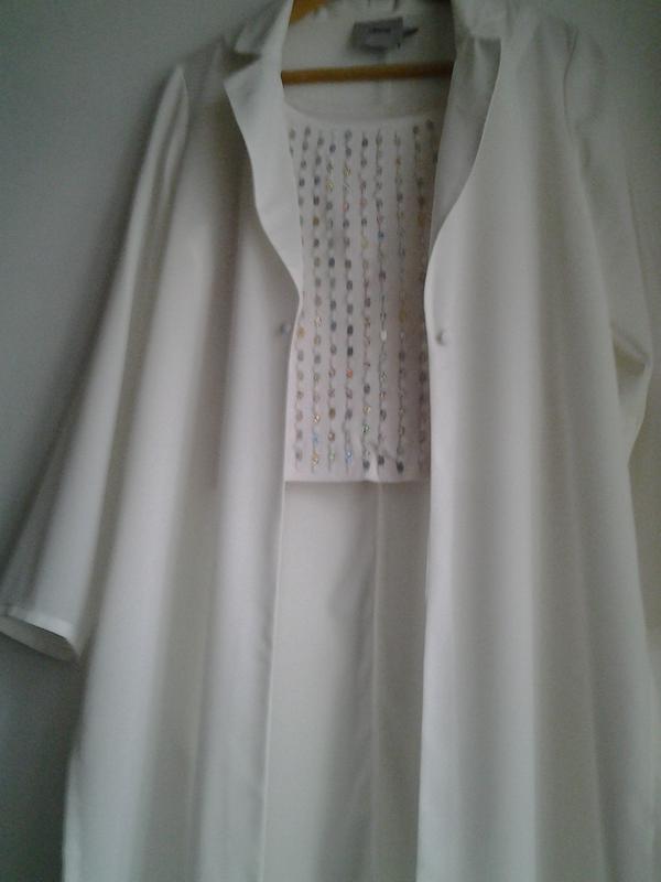 Стильный,элегантный Прямой Очень качественный шифон Приятный к телу Дорогой оттенок белого На бирке размер 6, но кардиган большемерит Длина 96 Рукав 58,5 Плечи 40 ОГ 48 Разрезы по бокам 38 Пройма 26