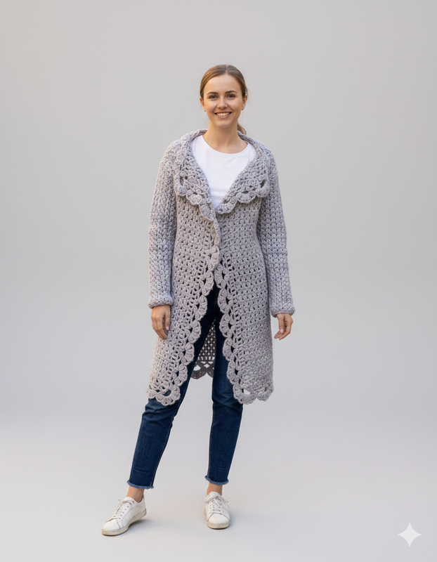 Серый длинный кардиган, с рукавами и воротником, ручная работа в емкость, размер 44-48. Можно застегнуть на красивую брошку, дополнительные замеры по запросу, отправляю по любой почте