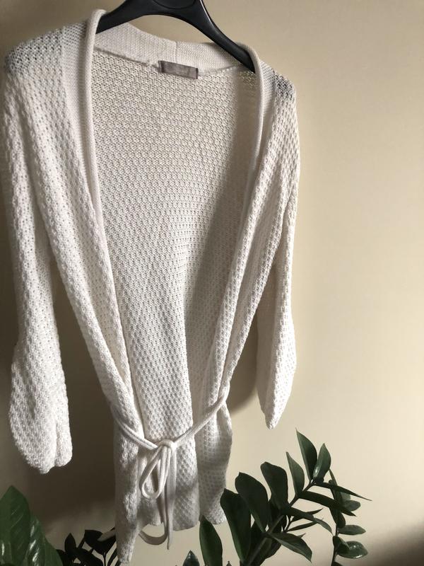 Кардиган білий з поясом, дрібної вязки, довжина - 74 см, рукав три четверті.