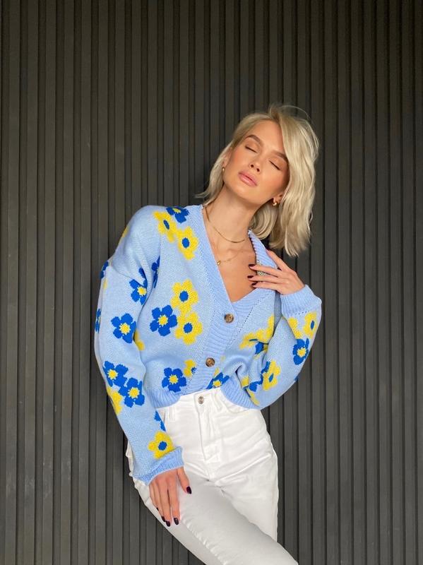 Арт 488 Кофта РОМАШКА 🇺🇦 Неймовірно стильна, та символічна кофта оверсайз, з принтом яскравих квітів Розмір : one size 42-48 Виповнена з акрилу Застібається ґудзиками по переду 1290 грн