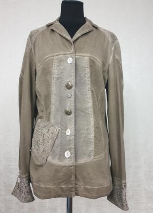 Стильний кардиган приталеного силуету оливкового кольору від сучасного німецького бренду модного одягу Malvin. Спинка і верхня частина рукава виконані з щільної бавовняної тканини. Застібка-планка спереду на ґудзики ручної роботи. На грудях кишені з клапанами на ґудзиках. Перед трохи довший спинки. Кардиган декорований аплікацією з сітки і мереживного полотна. Розмір 44 пог 54-58 см пот 48- 50 см поб 57-60 см др 66 см ди 66-71 см Буде ще багато фірмових речей. Підписуйтесь! Майте на увазі, що поки ви додаєте товар в ''обране'', хтось його вже купує. І ви можете пропустити свій шанс придбати річ, що сподобалася. Дешевше купувати відразу кілька речей-таким чином ви заощаджуєте на доставці. При покупці п'яти і більше речей та оплаті на карту продавцю відразу - доставка безкоштовна. Вдалих і приємних покупок!