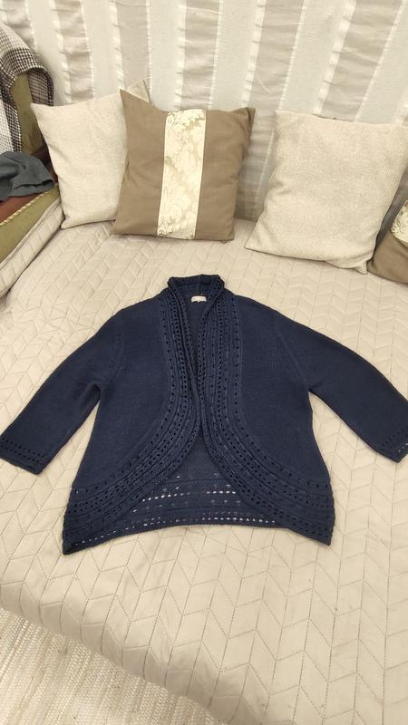 Кардиган,бохо.Колір темно синій.Колір нічного неба.Груба в'язка,ажур.Не защібується..Розмір 44-46 європейський.Український 52-54.ПОГ 56см,ширина в плечах 45 см Довжина рукава 59 см.Довжина 62 см.Скруглені поли.