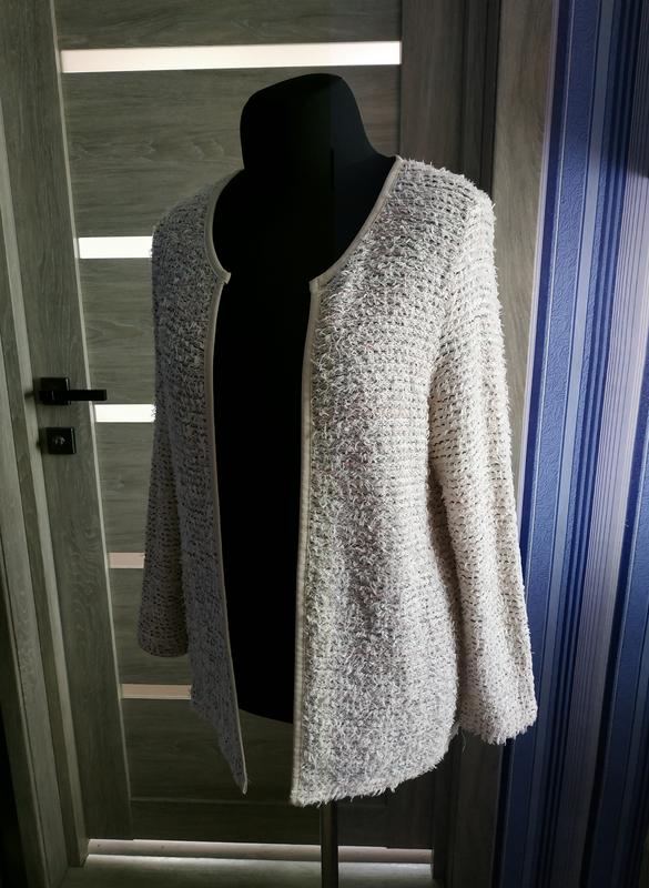 Светлый кардиган из материала типу "травка". Силуэт: прямой. Размер: M-L. Длина 66,5см. Ширина спинки 36см. Длина рукава 60см. Состав материала: 36% акрил, 28% разрезанное волокно, 19% полиэстер, 17% хлопок.