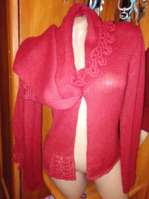 Ничего подобного не встречала,кардиган с длинным шарфом на месте воротника.Можно драпировать как угодно.Кофта темно-красного цвета,Застегивается на одну кнопку.25% шерсти,75% акрил.Бренд Kofler