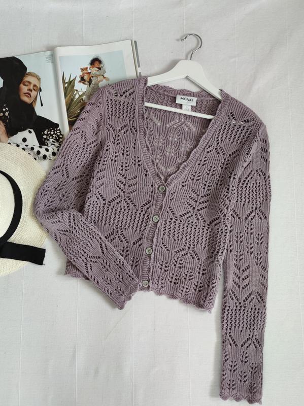 🌿ліловий кардиган від Monki красивої у язки Розмір:S Заміри:З грудей 45 см, довжина 50 см, довжина рукава 64 см Склад: котон