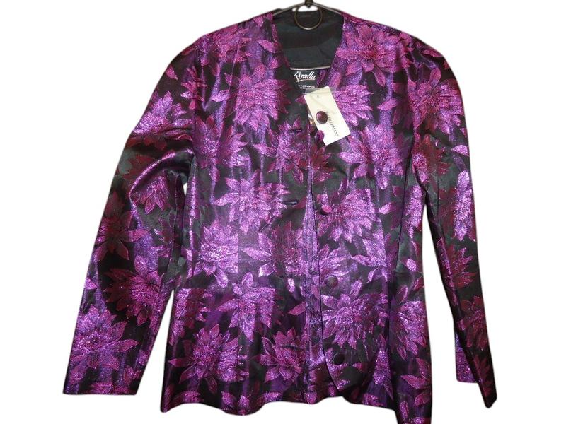 Нарядный кардиган - пиджак 50-52р (14р). Ткань легкая ,с блестящей, парчовой фиолетовой ниткой, не тянется. Может быть хорошим ансамблем к маленькому черному платью или топу. Без подкладки, ПОГ - 50см, ПОТ - 44см, ПОБ - 47см, длина - 65см, плечи - 40см, рукав - 58см