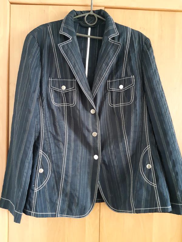 Продам жіночий жакет в гарному стані синього кольору в полоску плотна шовкова тканина заміри ширина плеча 46см довжина рукава від плеча 64см пог 60см довжина 68см