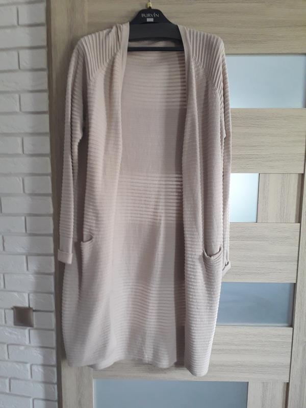Зручний довгий кардиган молочного кольору на кнопочках та з кишенями.