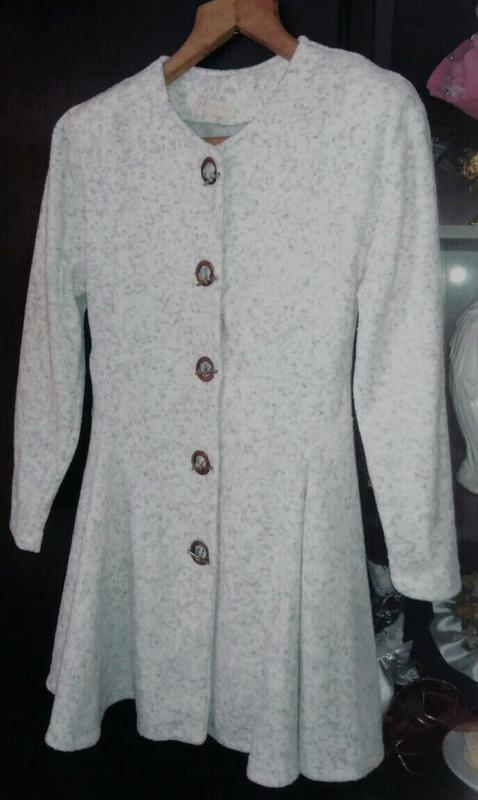 Кардиган-платье Hellena. Красивые и оригинальные пуговицы. Цвет бело-серый. С плечиками и внизу идет юбочкой. Прекрасно подчеркнет Вашу фигуру. Очень мягкая ткань. ORIGINAL! Такого не будет ни у кого! Примерно как сидит на теле , видно на последнем фото!