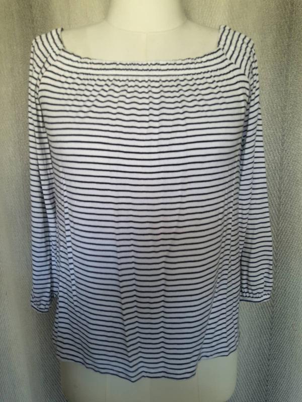 Женский вискозный лонгслив ы полоску, лонгслів у смужку открытые плечи в одному розмірі, тягнеться, може підійти на більший замеры в спокойном состоянии классная резинка на плечах 40 см, можна потянуть до 60 см, ПО груди 50 см, ПО низа - 55 см трапеция Длина по центру от резинки перед 45 см, сзади 50 см, ширина резинки 2,5 см длина рукава с резинкой и манжетом 51 см. ПО БИЦЕПСА 15,5 СМ, МАНЖЕТА 7,5 СМ-классная резинка ПРОЙМА с резинкой спереди 13 см, сзади 15 см ширина горловины 16 см, плече 12 см, высота воротника 10 см- изнутри воротника шов. хорошо тянется, очень приятный на ощупь. в идеальном состоянии смотрим весь профиль
