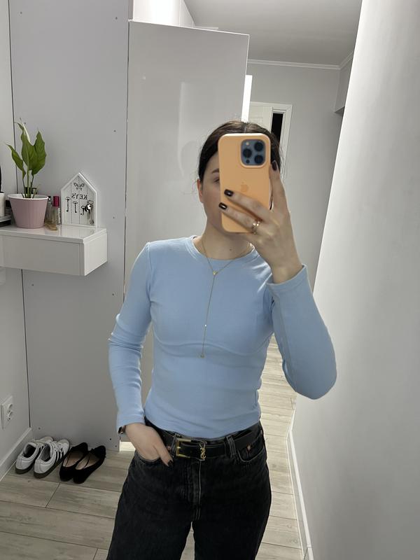 Вкорочений лонгслів із імітацією кісточок під грудьми,підійде на xs-s,врубчик,тканина щільна, у гарному небесному кольорі