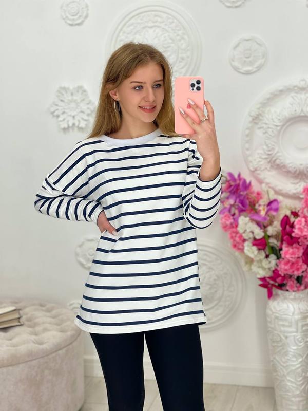 Лонгслів Модель 792VL Розміри 42-44,46-48,50-52 Тканина- турецька двухнитка Кольори- синій з білою смужкою; білий з синьою смужкою Вільний світерок в трендову смужку-морячку, на горловині біла рибана на двух кольорах, довгий , приспущений рукав, низ лонгзлива вільний. Параметри моделей: БАТАЛ ОГ108-ОТ86-ОС108, ріст 165, на ній представлений 50-52; НОРМА ОГ95-ОТ65- ОС95, ріст 170, на ній представлений 42-44.