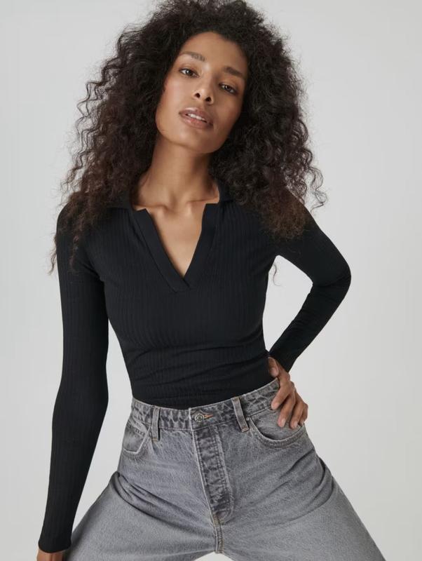Черный топ в рубчик, с воротничком😍 Размер S Длина - 49см ОГ - 79- 90см Рукав - 62см Заебала себе, не угадала с размером к сожалению😕