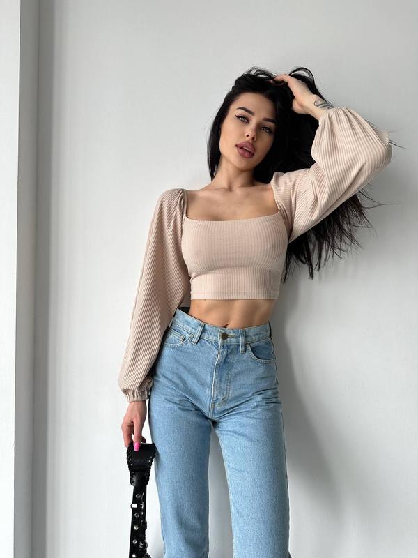 Топ в рубчик с шнуровкой завязками на спинке и объемными рукавами бежевый