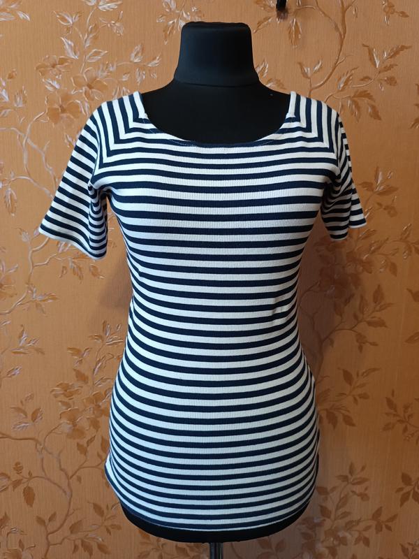 Классическая тенниска в плотный рубчик, красиво садится по фигуре. Стан идеален, только срезанная этикетка со складом. Замеры сделают, s, может быть на небольшую м, тянется.